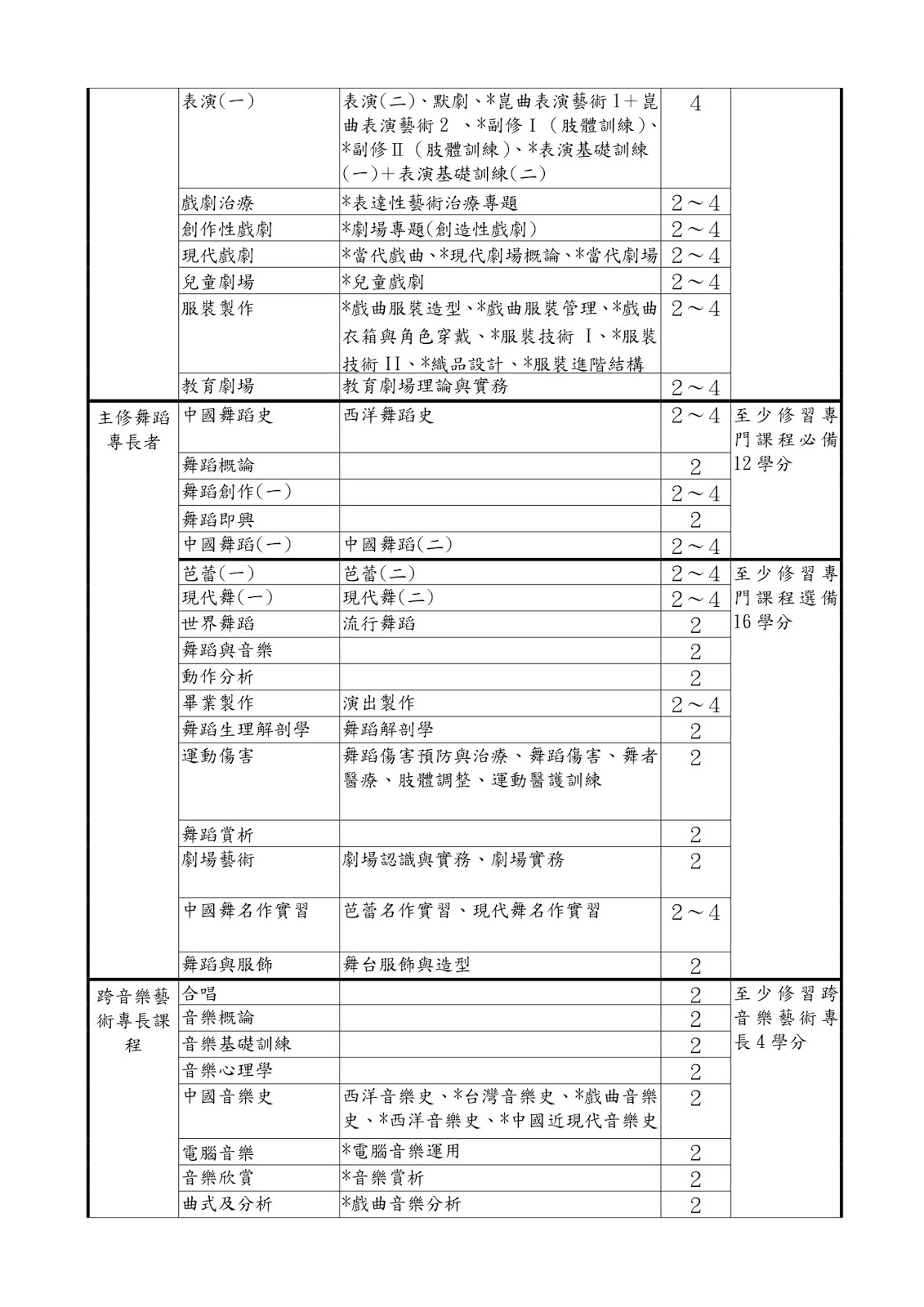 (四)表演藝術科學分:「藝術群-表演藝術科」教師專門課程科目學分表